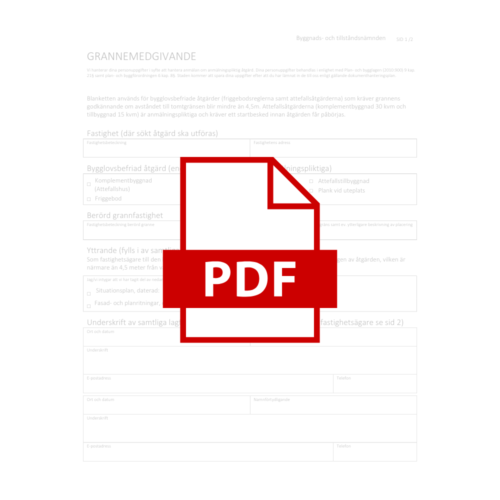 Ska du bygga nära tomtgräns, uppföra komplementbyggnad eller göra åtgärder som kan påverka grannen? Handläggaren kan då begära ett grannemedgivande. Med vår grannemedgivande mall (PDF) får du ett tydligt och korrekt dokument som är lätt att fylla i och som följer hur kommuner normalt vill ha uppgifterna presenterade. Mallen innehåller vägledning rad-för-rad och exempeltext som gör det enkelt att formulera yttrandet rätt – och minskar risken att ärendet fastnar på kompletteringar.